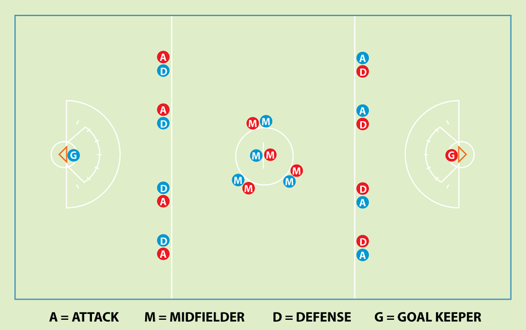 Each team has 12 field players and a goal keeper. Field players are designated by three different positions: attack, midfielder and defense. Attack players are considered offensive players, those who are focused on goal scoring. Defense players are those who prevent the opponent from scoring goals. Midfielders (aka middies) are the players that do both defensive and offensive play. Although these position names imply a specific purpose, all positions play defense when their team does not have possession of the ball and play offense when their team does have the ball. Coaches typically give each player specific details for their position that might include where to play on the field or which opponent to cover.