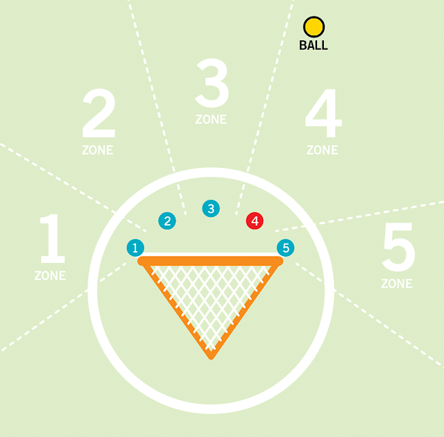 The five-position goalkeeper method teaches the keeper automatic net positioning. The diagram above shows the ball in zone 4 and the goalkeeper in the correct corresponding number 4 position.